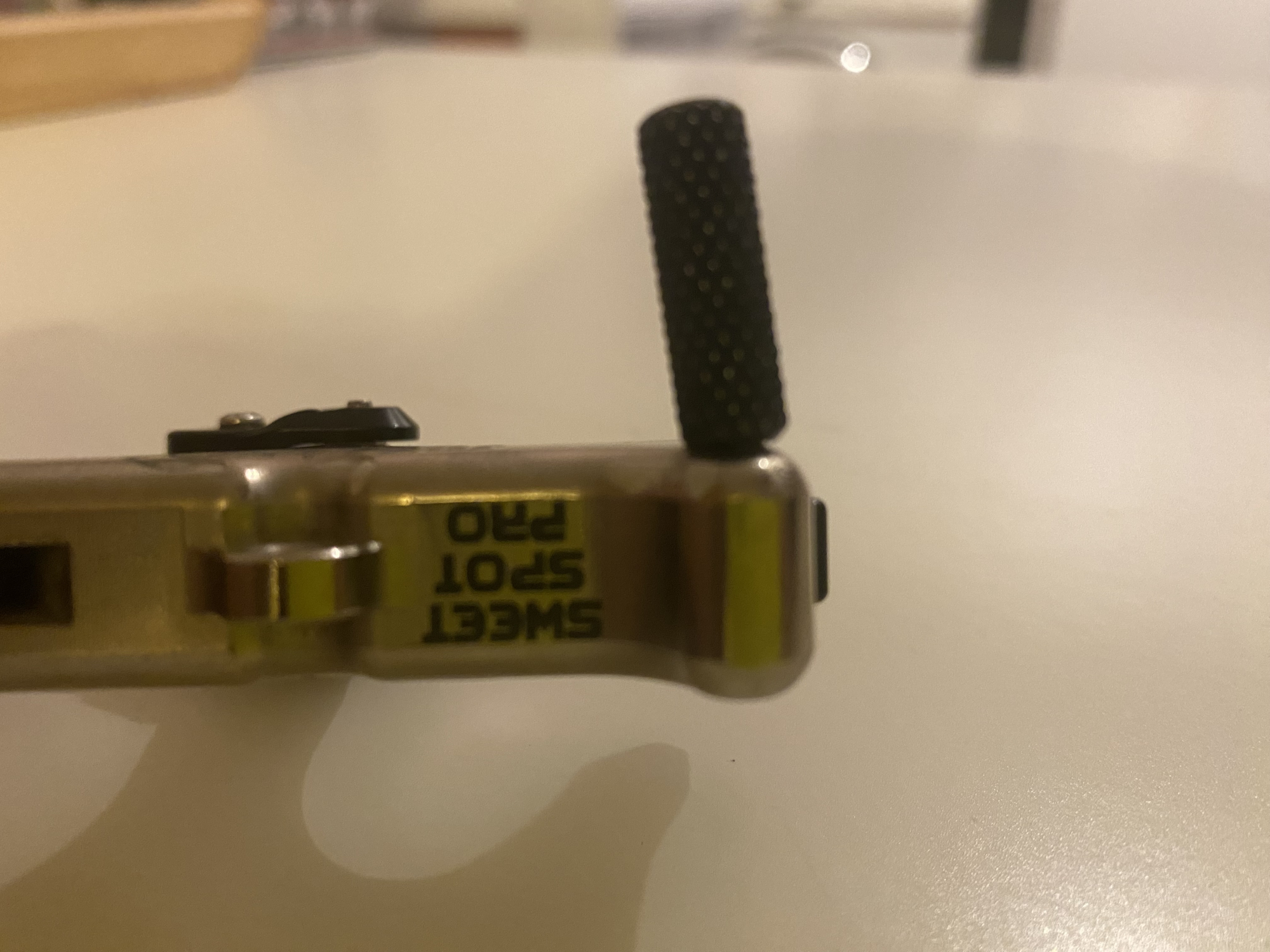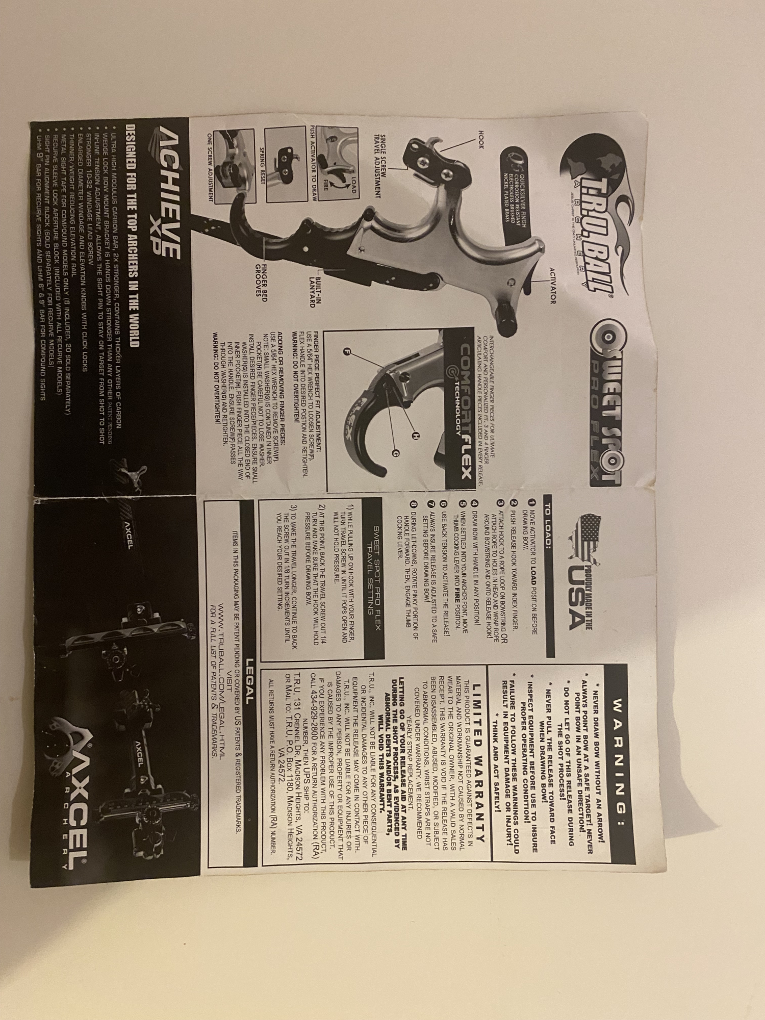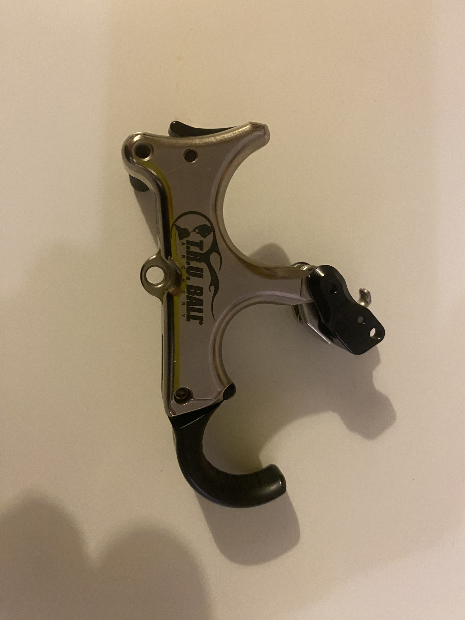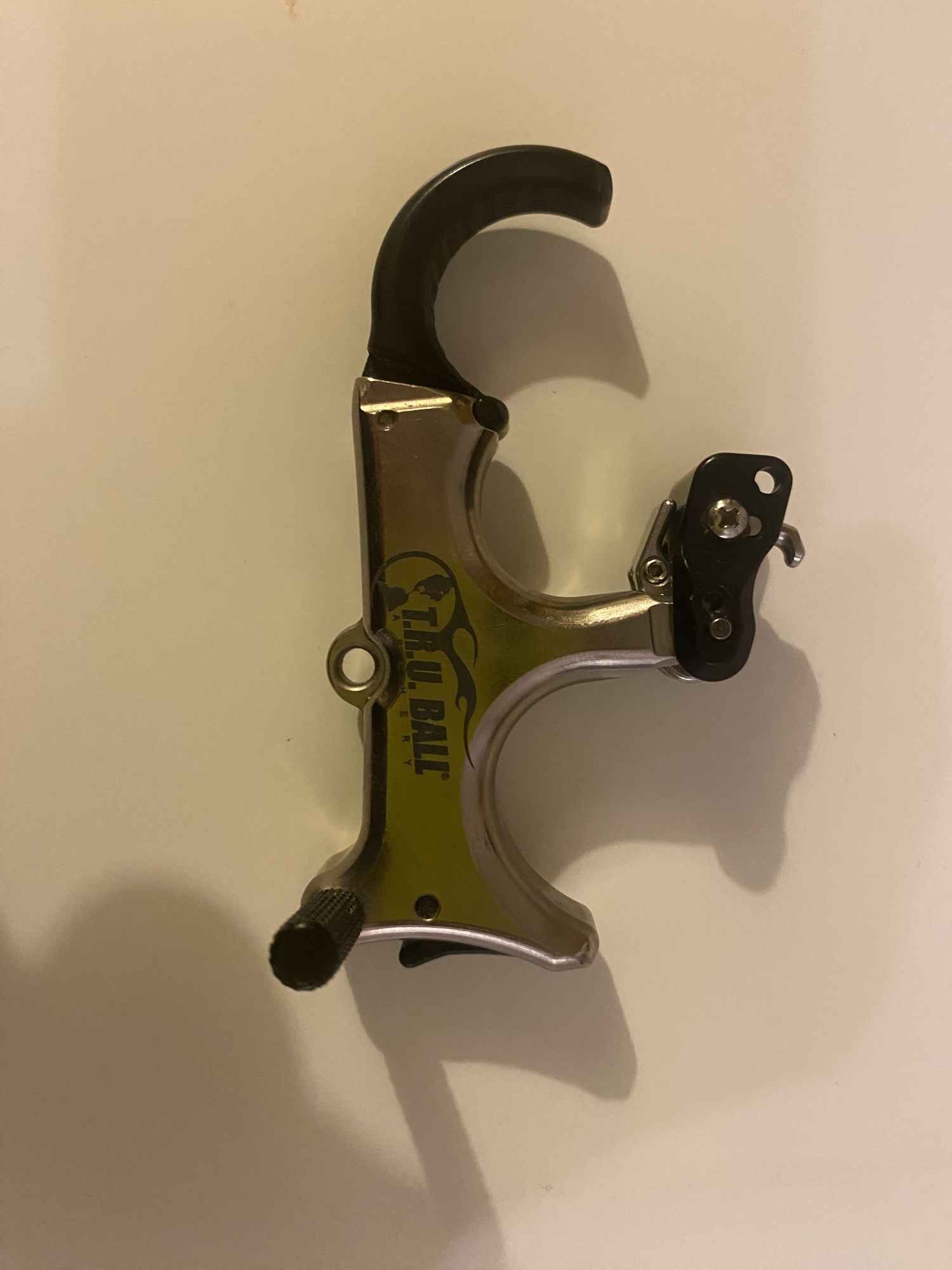 Tru ball sweet spot pro flex. Hinge release with safety feature. The thumb ‘peg’ is slightly bent, but doesn’t affect the release. See pic. Great release aid.