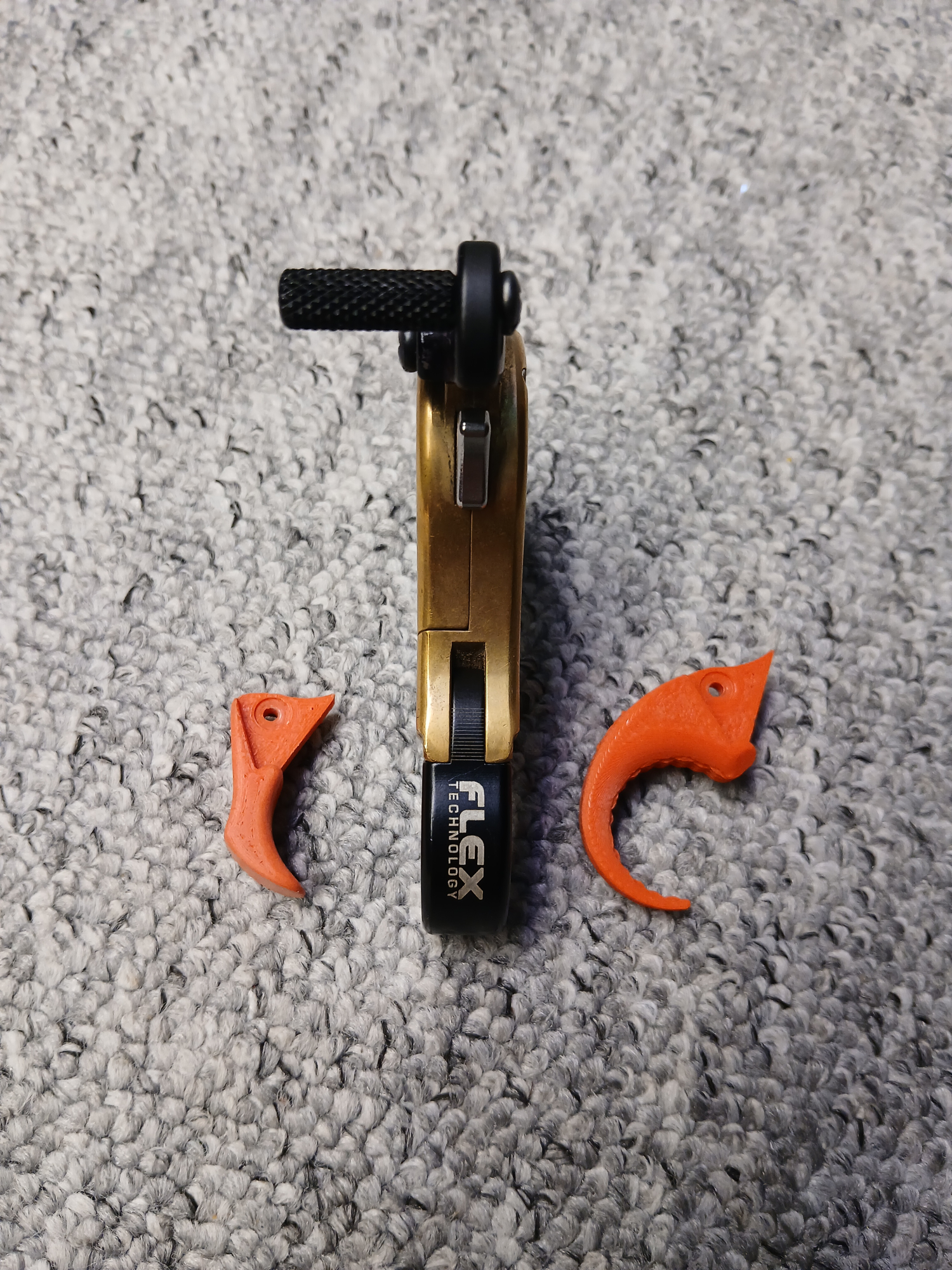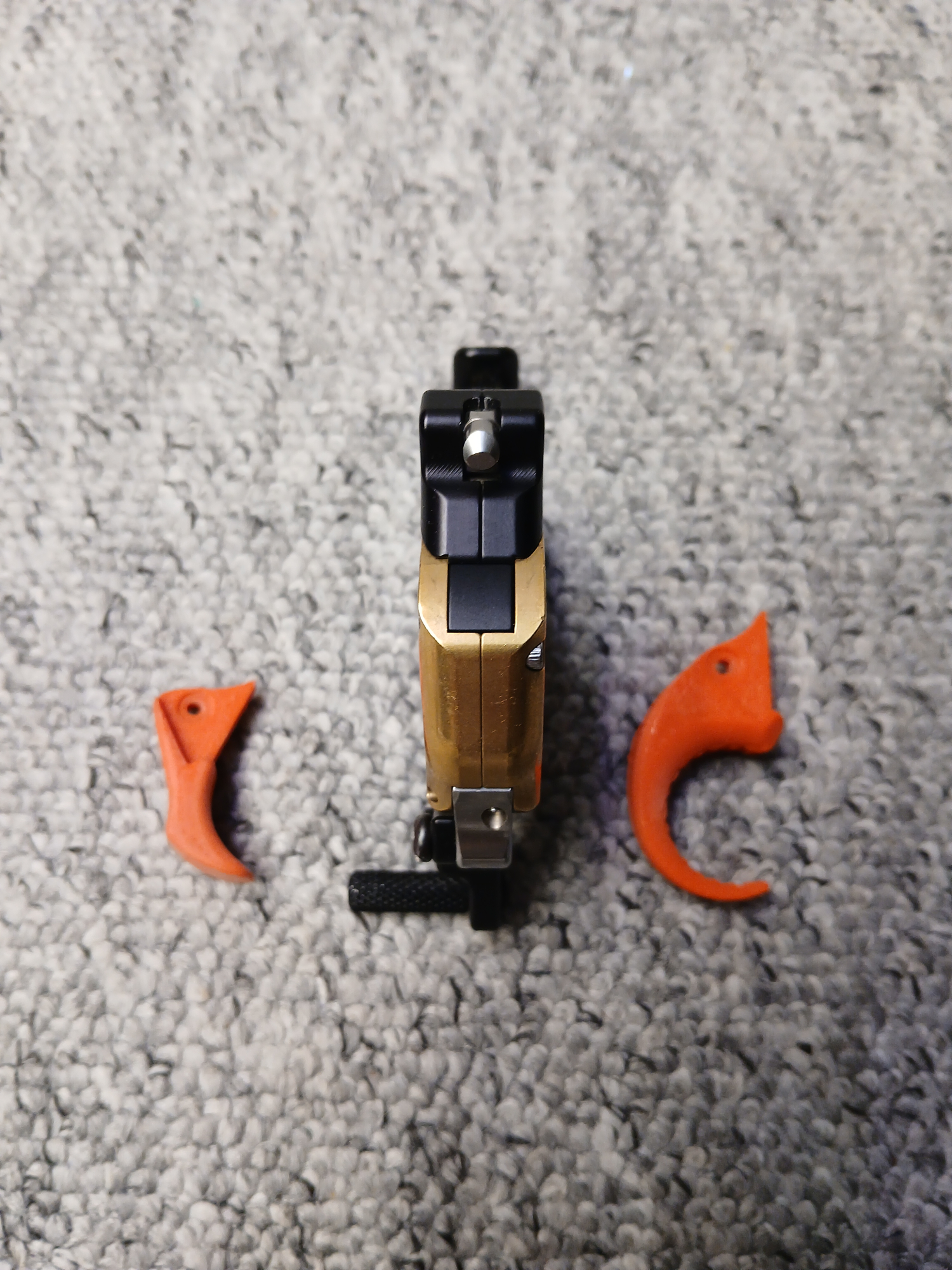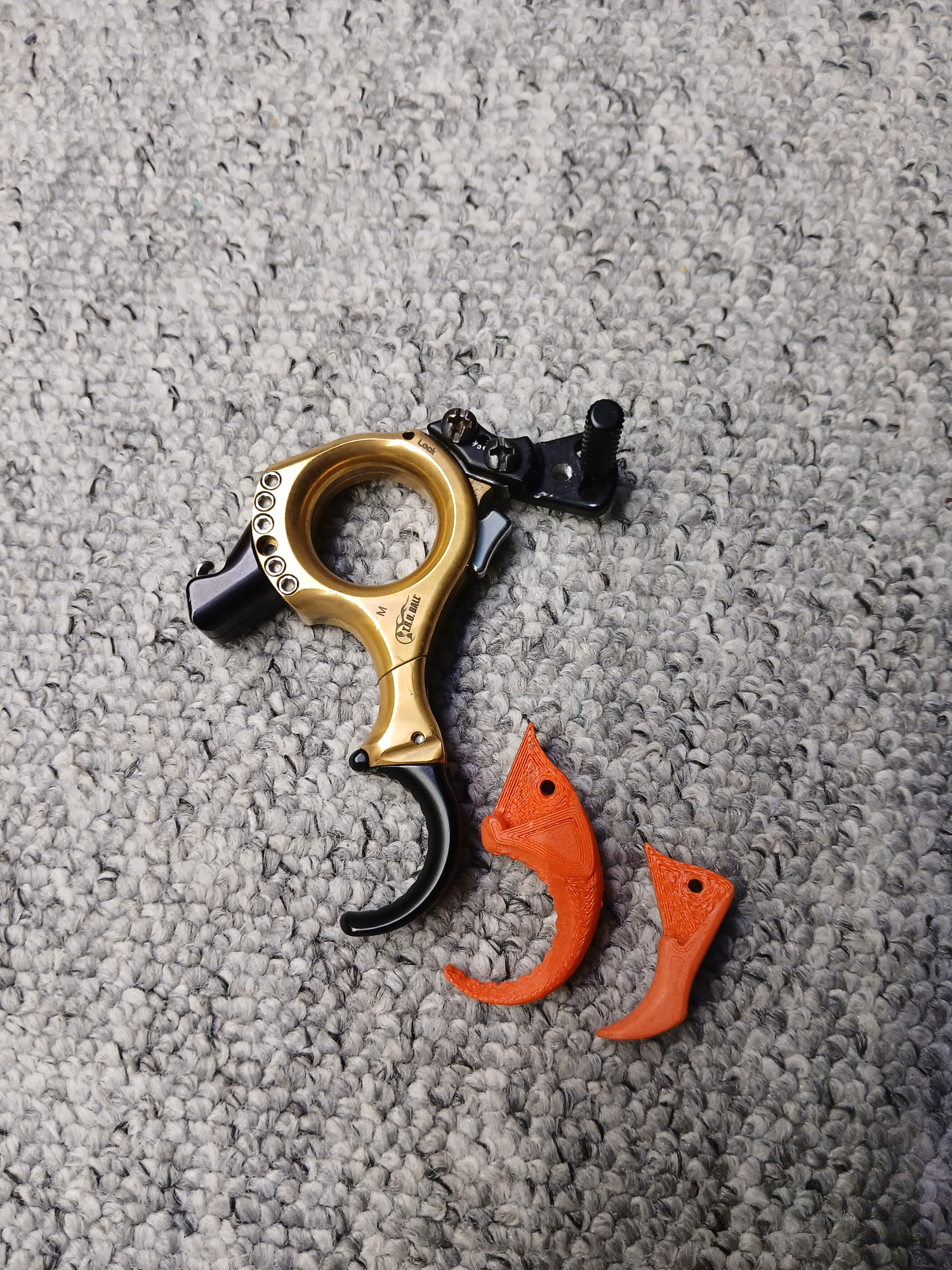 This release aid is a medium thumb trigger ,nice and crisp . It comes with two 3-D printed finger attachments . Bronze