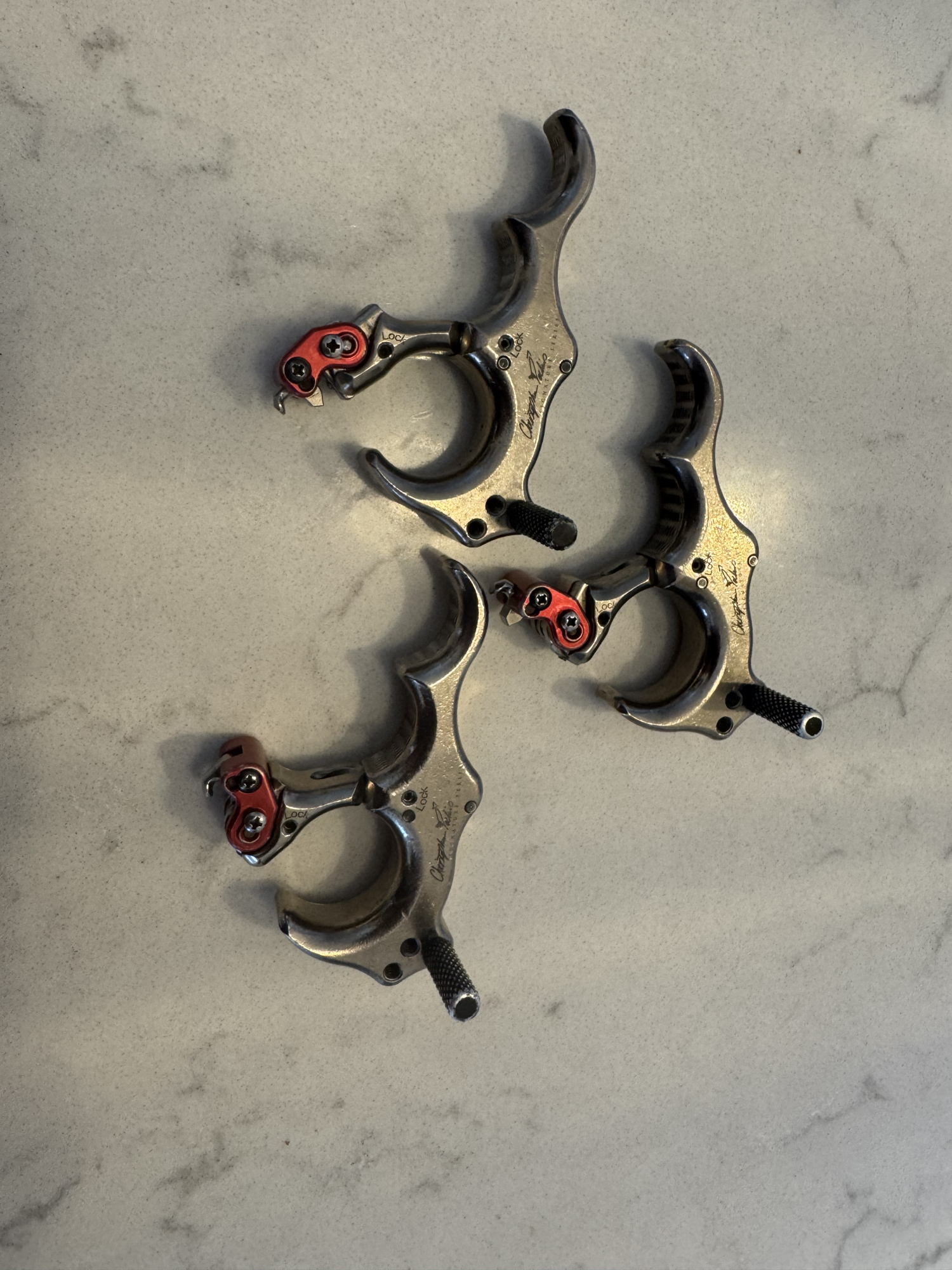 £120 posted for each, 3 available, signature series tribal executive hinge, superb release aids, ambidextrous, thumb pin can be positioned for left or right handed. good condition (£279 new)