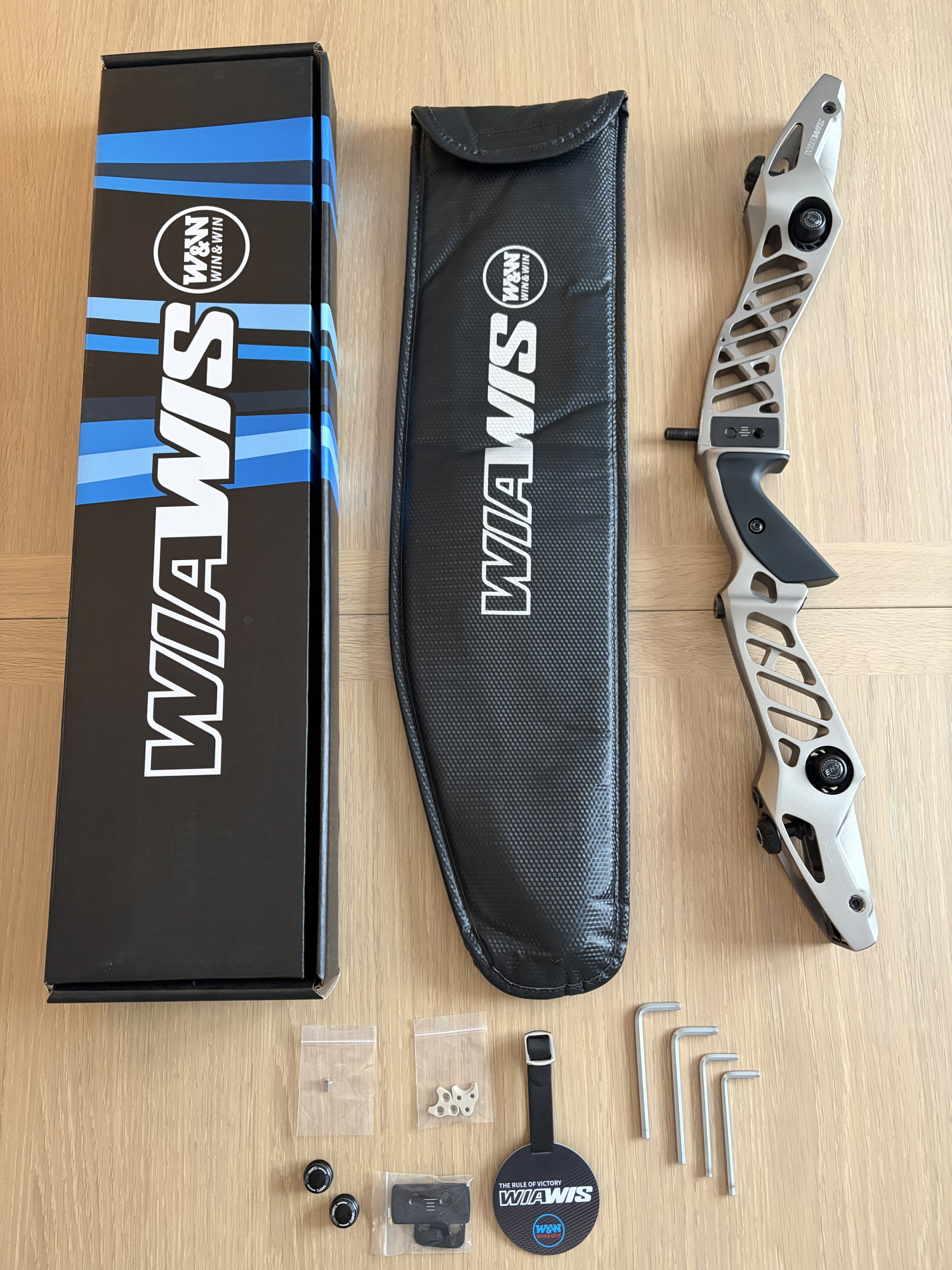 Comes with all accessories (riser bag, original grip, both sets of arrow rest plates, flat caps and weights for harmonic dampers, Allen keys, replacement plastic shoes for the limb pocket, clicker hole screw, and luggage tag)