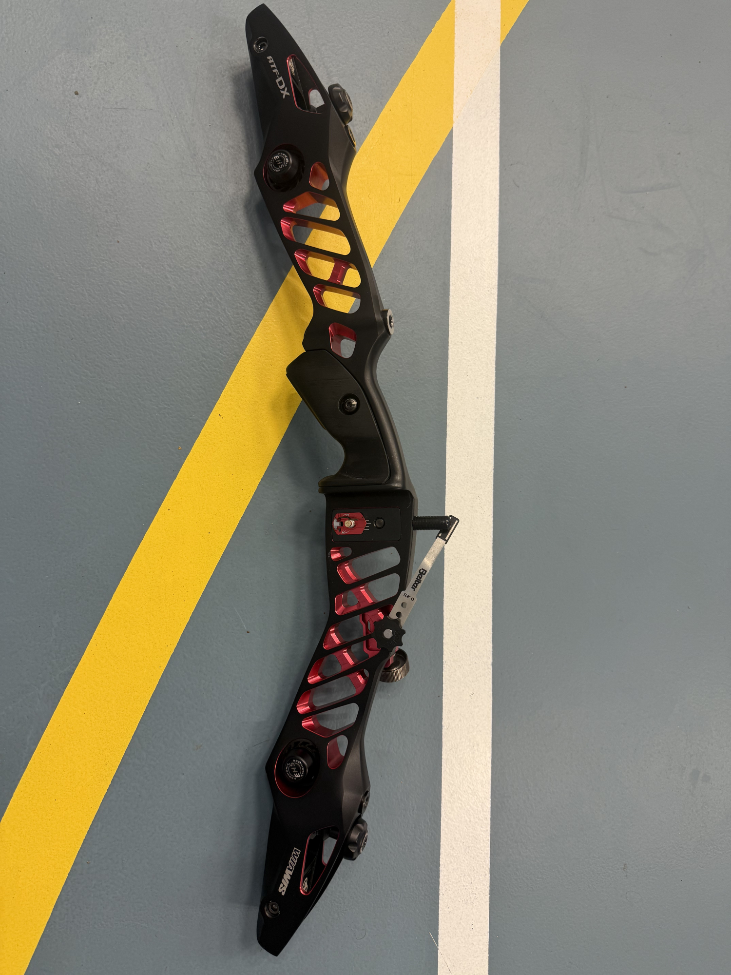 Win & Win Wiawis ATF-DX Recurve Riser - 25" - Right Handed - Black/Red which also comes equipped with Beiter clicker, Shibuya DX Gold Tip Button in red and Shibuya arrow rest also in red.